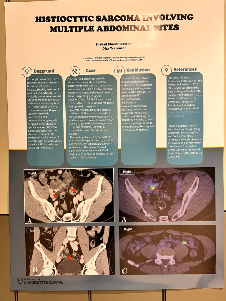 “På DRS 2025 blev der præsenteret en poster om histiocytisk sarkom hos en 52-årig mand, repræsenteret med uforklarlige abdominale symptomer. Diagnosen blev bekræftet ved avanceret billeddiagnostik, immunhistokemi og genetisk analyse. Patienten blev behandlet med seks serier ICE-kemoterapi, hvilket resulterede i betydelig klinisk forbedring. Casen understreger vigtigheden af en multidisciplinær tilgang og præcise diagnostiske metoder ved sjældne hæmatologiske maligniteter.”