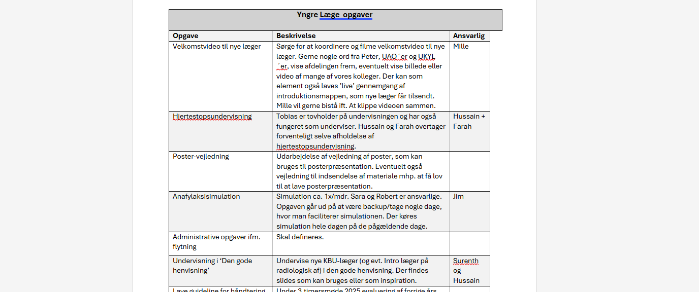 Dennne liste er opgaver som uddannelseslæger i afdelingen kan deltage i, såfremt de ønsker det. Nogle opgaver mangler tovholder, hvor YL kan melde sig. Andre opgaver er der allerede en tovholder på, og ønsker du at hjælpe med denne opgave, så tager du bare fat i den angivne tovholder.